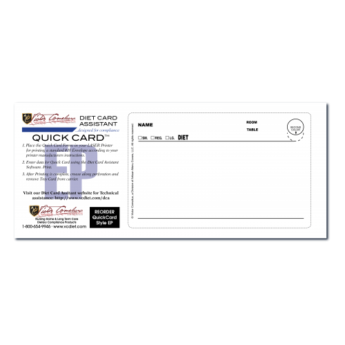 Diet Card Assistant Paper Diet Cards · Use our DCA (Diet Card Assistant) Software to complete card and print from your LASER or Inkjet Printer Remove perforated Card from Carrier · Diet Changes Easily Made · NOT Dishwasher Safe · Temorary Information can be written on optional laminate and easily removed with alcohol. · 100 per pack