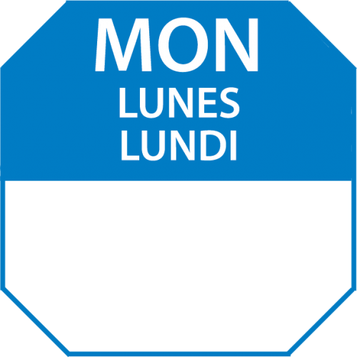 MONDAY (Blue) English, Spanish and French. Individual Day Labels aid in preparing food for specific days. 750 per roll.
